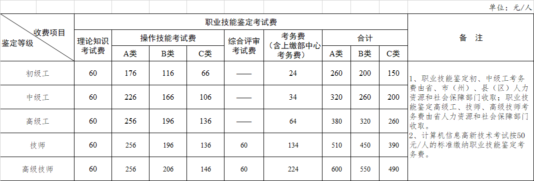 湖南省职业技能鉴定收费标准表