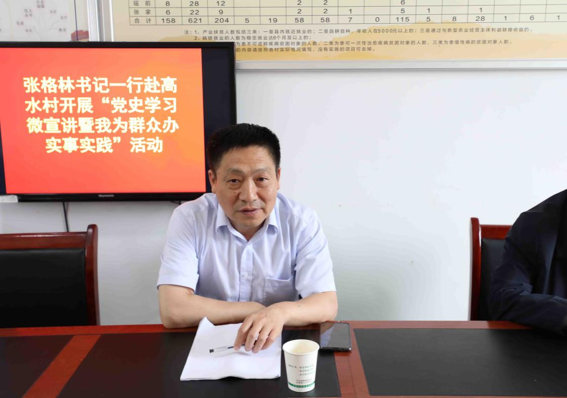 张格林对工作队进驻以来的工作表示肯定,他指出抓好乡村振兴工作一是要抓好班子建设。以组织振兴带动乡村振兴;二是要抓好扶贫成果巩固。切实巩固拓展扶贫攻坚成果,确保广大村民脱贫不返贫,振兴不掉队,朝着共同富裕的目标稳步前行;三是抓产业发展。将乡村产业进一步发展起来,拓宽村民就业、增收渠道,让更多农民实现就地就近就业,实现村民富裕富足;四是抓基础设施建设。争取一定资金,完善村级道路、路灯、水渠等基础设施;五是抓好村风治理。真正实现村民富、村庄美、村风正,推动乡村全面振兴。当天,张格林还为高水村支委班子上党课,讲述了在党的领导和关怀下,乡村发生的一系列翻天覆地的变化。