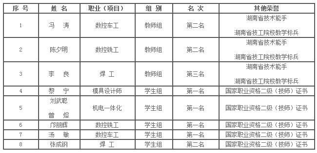经过10天紧张而激烈的角逐,大赛落下帷幕,陈夕明等9名选手获得了各职业教师组前3名,被省人社厅授予“湖南省技术能手”和“湖南省技工院校教学标兵”荣誉称号,同时颁发相关国家职业资格二级(技师)证书,报名前已取得同职业国家职业资格二级(技师)证书的选手,颁发国家职业资格一级(高级技师)证书;黎宁等27名选手获得各职业学生组前三名,分别颁发获奖荣誉证书和奖金,同时颁发相应比赛职业国家职业资格二级(技师)证书。