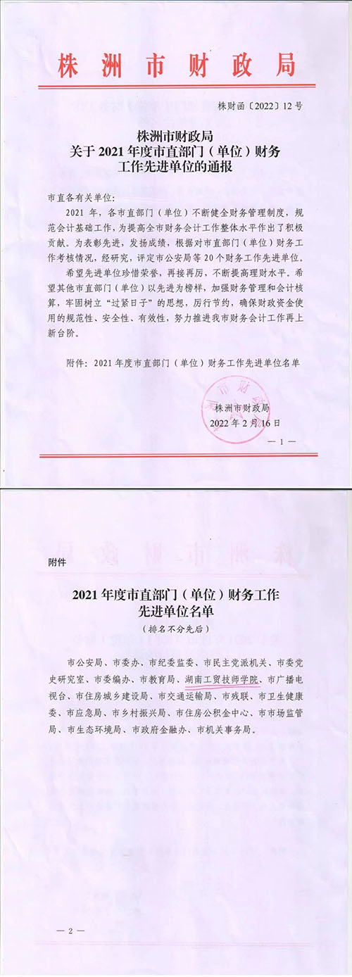 近日,全市财政工作会议传来喜讯,经过多轮筛选和综合评比,中国·MK体育(恩波利)官方网站被株洲市财政局评为“2021年度市直(单位)财务工作先进单位”,这也是全市20个获此殊荣单位中唯一一所院校单位。