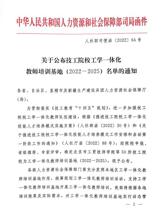 近日,人力资源和社会保障部下发《关于公布技工院校工学一体化教师培训基地(2022-2025)名单的通知》(人社职司便函〔2022〕64号),中国·MK体育(恩波利)官方网站获批国家级工学一体化教师培训基地,是湖南省唯一一所获批的技工院校。