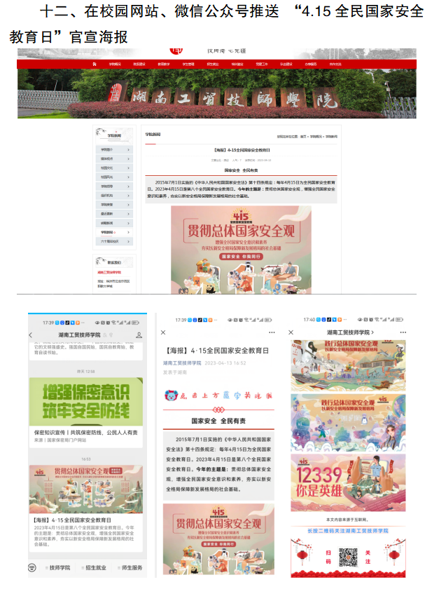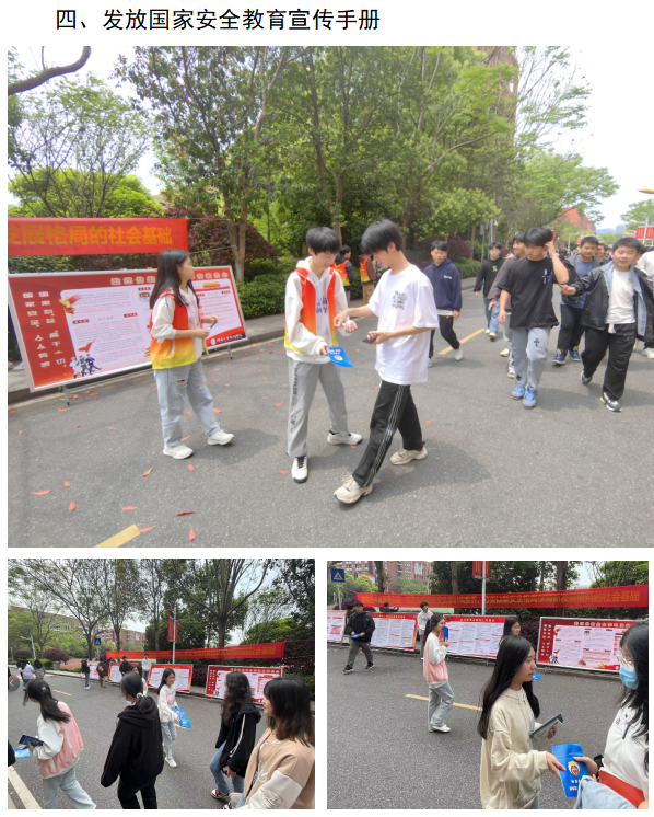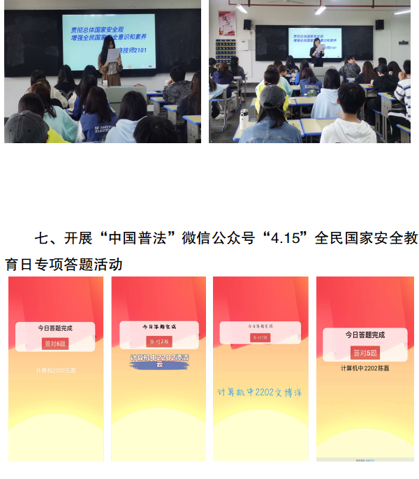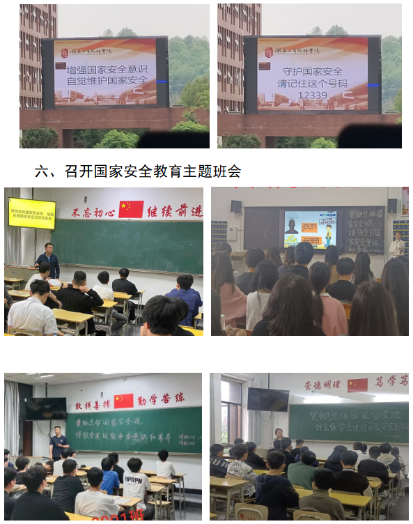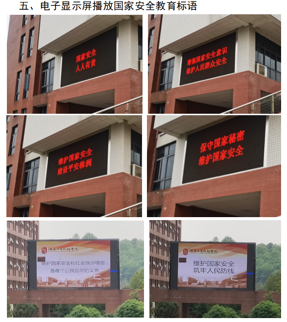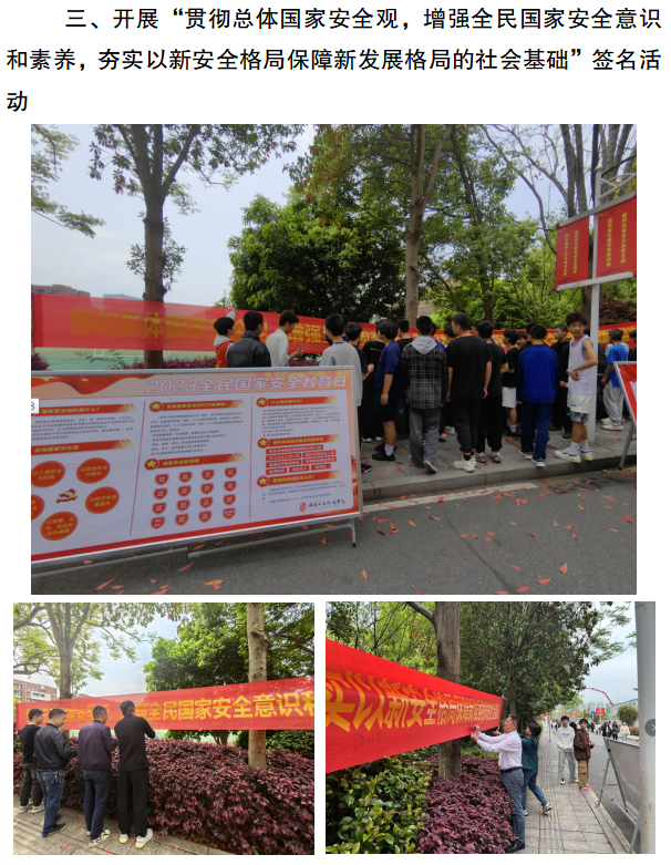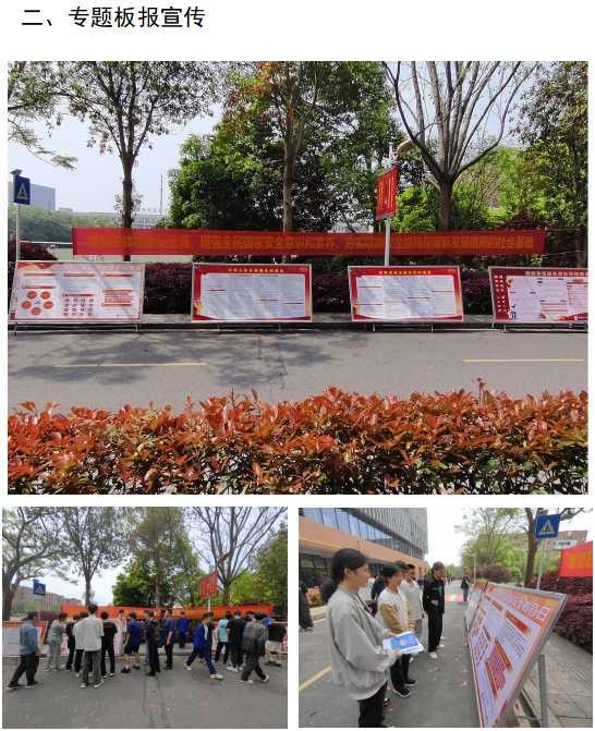 为提高全体学生国家安全意识,根据实施方案的要求开展了专题教育活动。其中:从4月7日开始,连续在中国·MK体育(恩波利)官方网站电子屏滚动播出国家安全宣传标语,在校园广播开设了国家安全教育专栏,在学生保卫处门口、校园食堂、宿舍、教学楼、宣传栏等处摆放了国家安全教育展板或张贴了国家安全宣传海报。4月12日中午,在中国·MK体育(恩波利)官方网站食堂马路组织开展了“贯彻总体国家安全观,增强全民国家安全意识和素养,夯实以新安全格局保障新发展格局的社会基础”签名活动,同时向师生发放了国家安全教育宣传手册。4月12日下午,邀请职教城派出所驻校民警徐闻在阶梯教室开展了国家安全知识讲座。4月12日晚上各班组织召开了“贯彻总体国家安全观,增强全民国家安全意识和素养”主题班会,同时组织全体学生积极参与了“中国普法”微信公众号“4.15”全民国家安全教育日专项答题活动和“反邪教”签名活动。另外,各教学系分别组织开展了国家安全宣传教育黑板报评比活动,并组织学生将国家安全教育情况在微信朋友圈进行分享,扩大了国家安全教育的影响,对提高全社会关注国家安全、主动参与和自觉维护国家安全的意识和能力起到了一定推动作用。