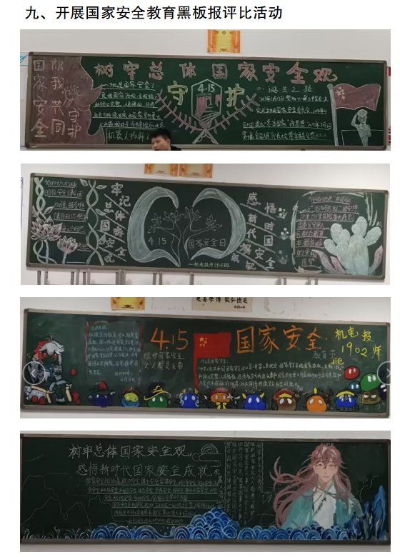 学生保卫处4月10日召开了院系两级学生管理工作会议,对做好“国家安全教育日”宣传教育工作提出了要求。各系部严格按照实施方案抓好落实,分别组织召开系部班主任工作会议进行了布置,充分利用主题班会、工贸大讲堂、宣传栏、黑板报、电子显示屏、宣传展板、宣传挂图、宣传横幅等多种途径在师生中广泛开展国家安全宣传教育,营造了良好的宣传教育氛围。
