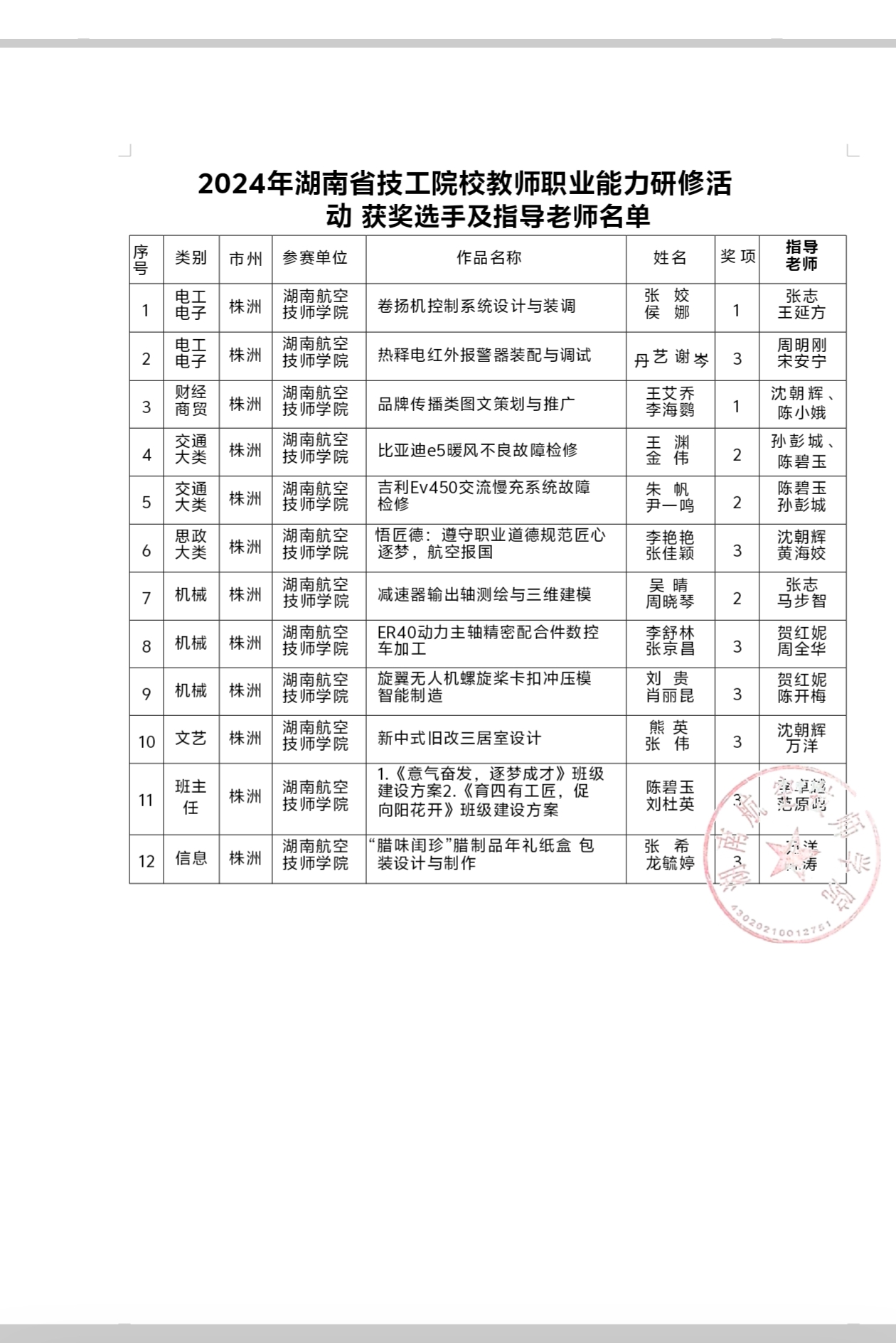 2024年湖南省技工院校教师职业能力研修活动湖南航空技师中国·MK体育(恩波利)官方网站获奖作品指导老师公示