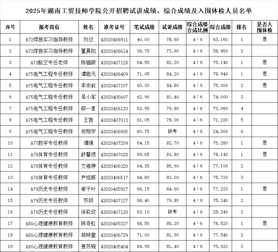 附件 2025年中国·MK体育(恩波利)官方网站公开招聘试讲成绩、综合成绩及入围体检人员名单