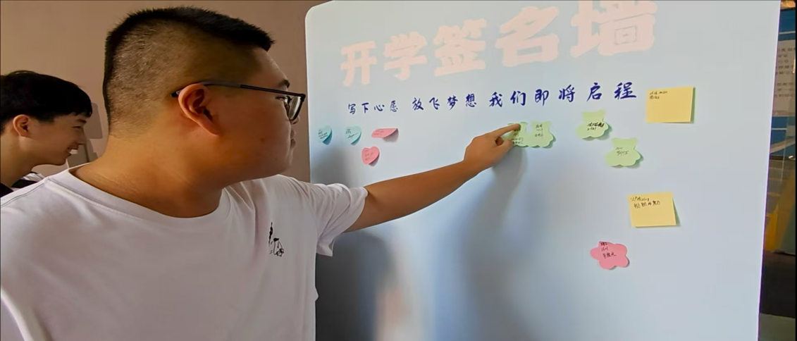 在所有准备工作就绪后,航空工程系迎来了一张张新面孔,处处洋溢着青春的热情与喜悦。随着新生们的步伐越来越近,教学楼前也慢慢的排起了长龙。刚进门,有细心的同学便发现有一块写着“欢迎新同学”的温暖字样的签名墙。在第一位同学的率先带动下,不多久签名墙便被同学们的祝福和对未来美好的憧憬给淹没,为签名墙增添了浓浓的色彩。
